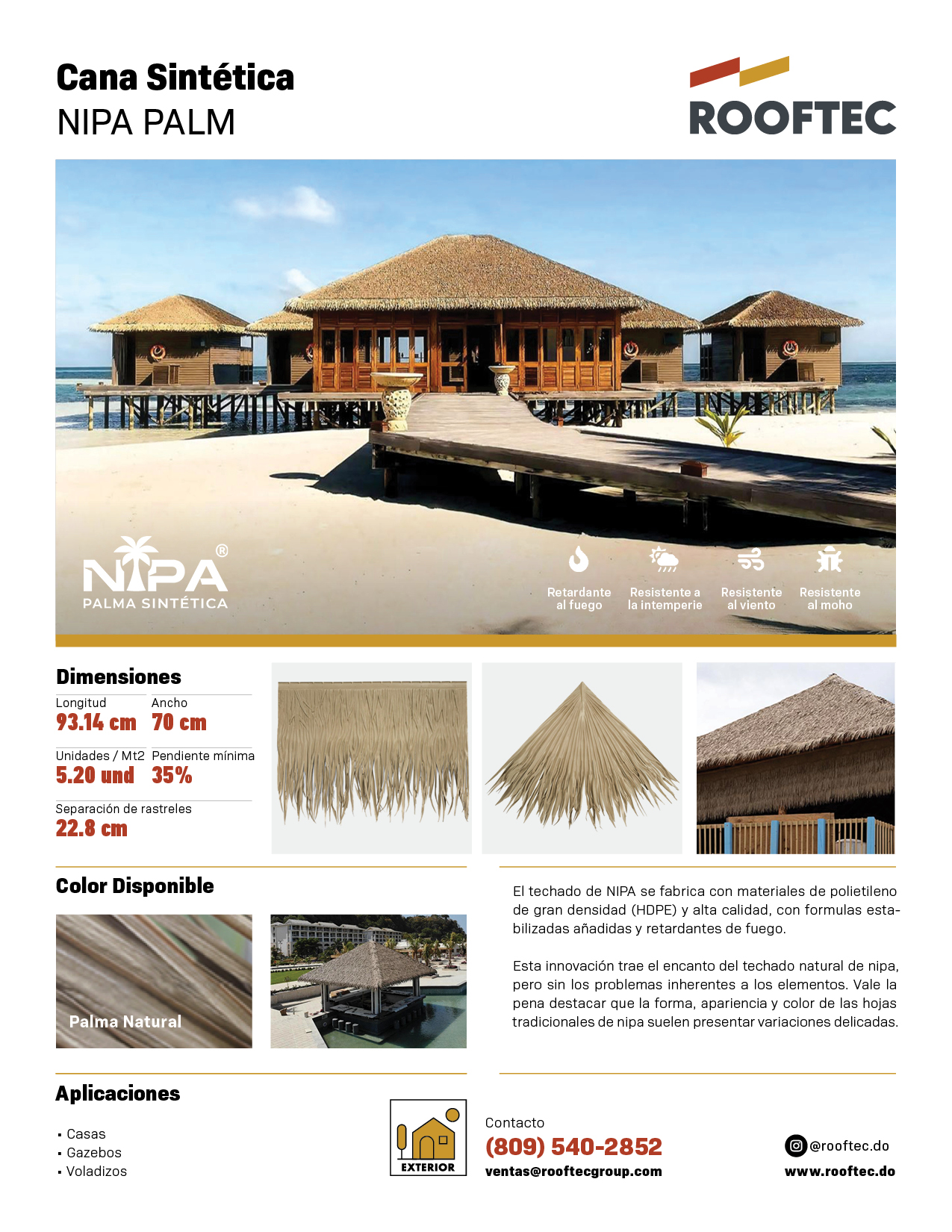 NIPA Palm combina la estética auténtica de la palma natural con la durabilidad de la ingeniería moderna. Diseñada y probada en Estados Unidos, ofrece un rendimiento superior frente a fuego, humedad, moho y plagas, asegurando techos limpios y de larga vida útil. Su certificación de resistencia a vientos de 200–260 km/h la convierte en la solución ideal para zonas tropicales y de huracanes. Con texturas realistas y un acabado sofisticado, aporta encanto natural sin las desventajas de la palma tradicional.