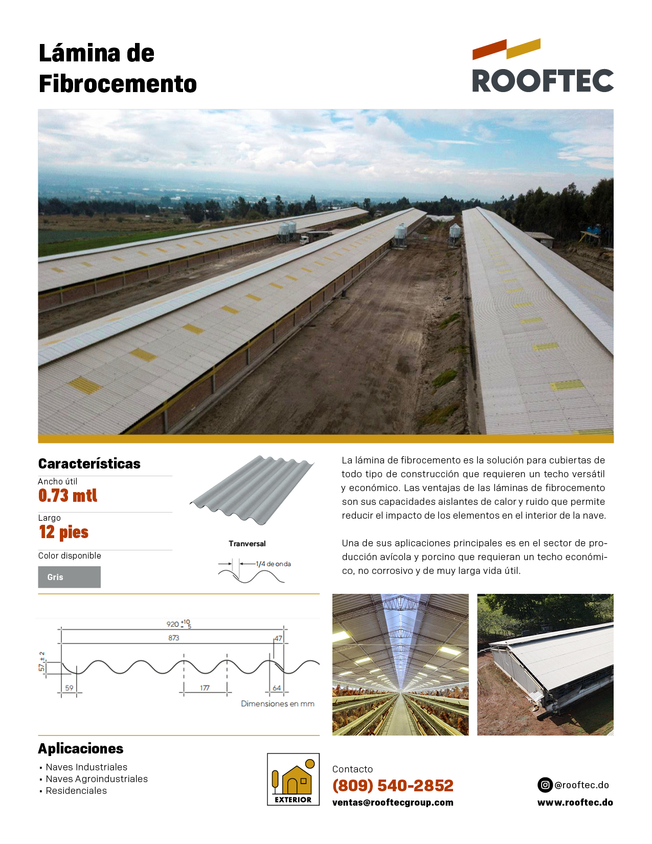 Una de sus aplicaciones principales es en el sector de producción avícola y porcino que requieran un techo económico, no corrosivo y de muy larga vida útil.