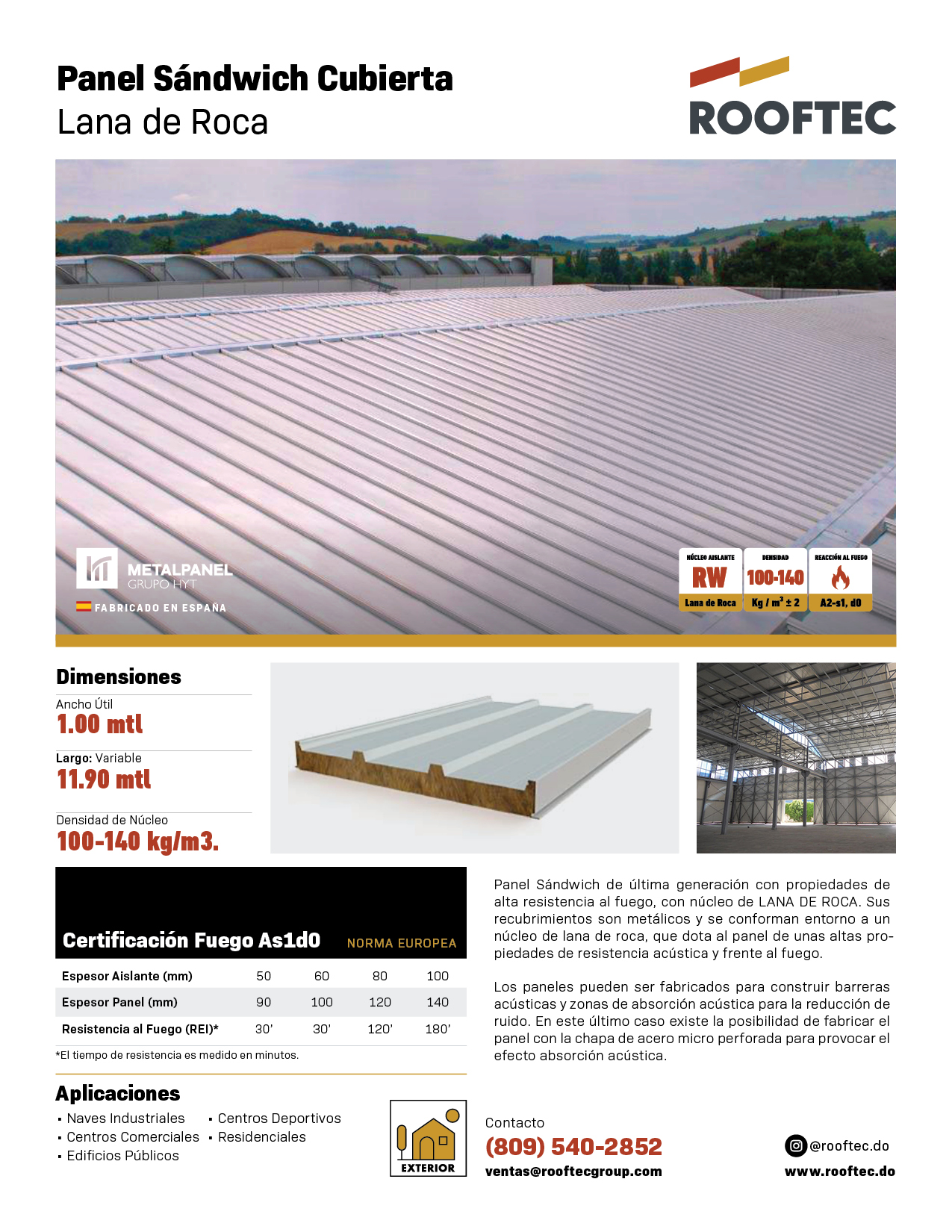 Panel Sándwich de última generación con propiedades de alta resistencia al fuego, con núcleo de LANA DE ROCA. Sus recubrimientos son metálicos y se conforman entorno a un núcleo de lana de roca, que dota al panel de unas altas propiedades de resistencia acústica y frente al fuego.