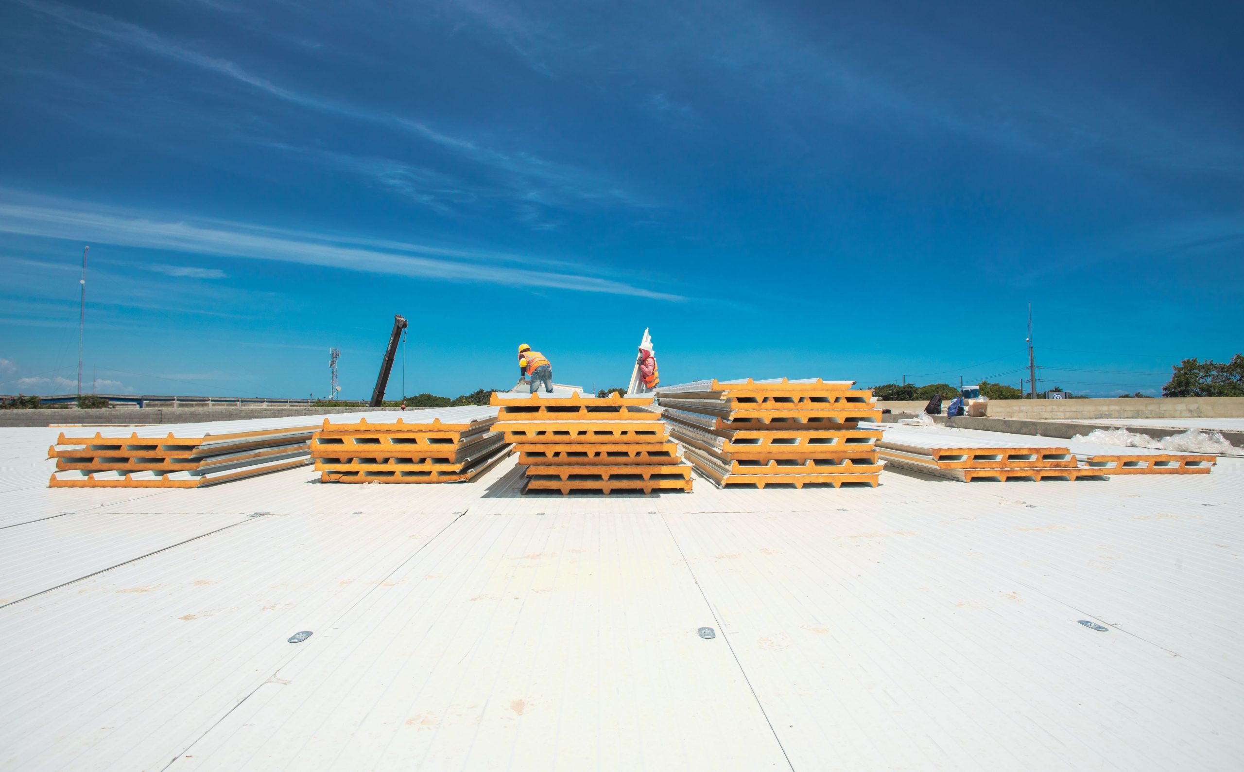Panel sándwich para cubiertas planas, compuesto por dos caras metálicas y núcleo de poliisocianurato (PIR) desarrollado para cubiertas industriales y comerciales con una pendiente mínima del 1%.