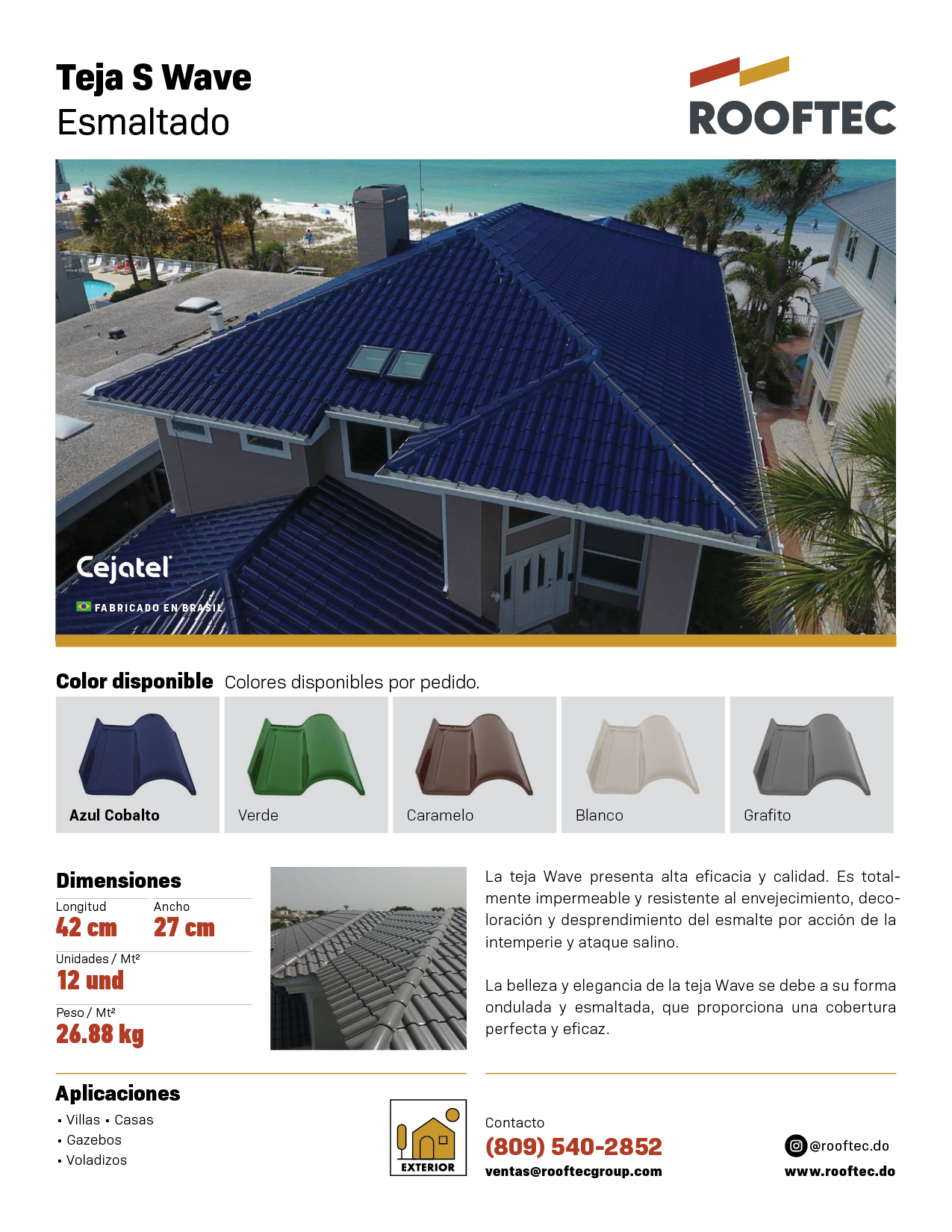 La teja Wave presenta alta eficacia y calidad. Es totalmente impermeable y resistente al envejecimiento, decoloración y desprendimiento del esmalte por acción de la intemperie y ataque salino.